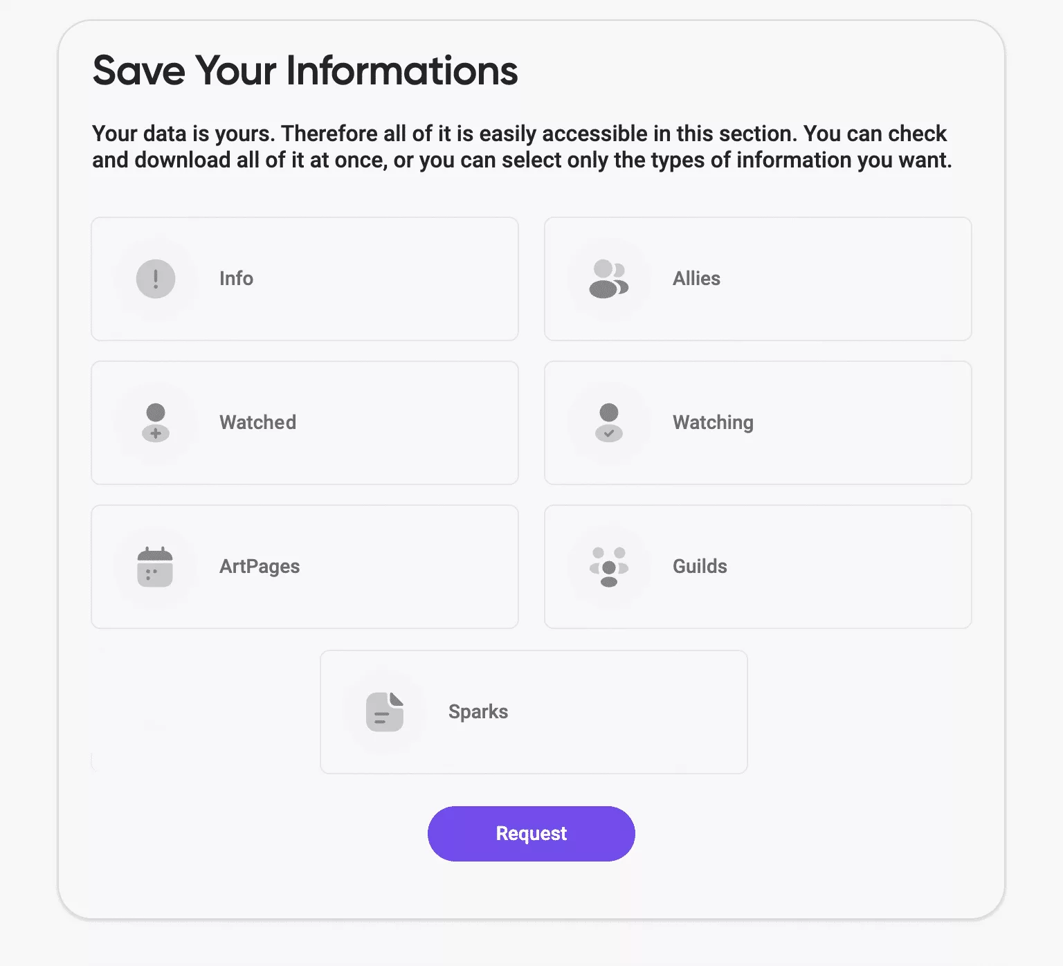 You can also always access all of your data, download it or even remove it totally from ArtGuilds itself.